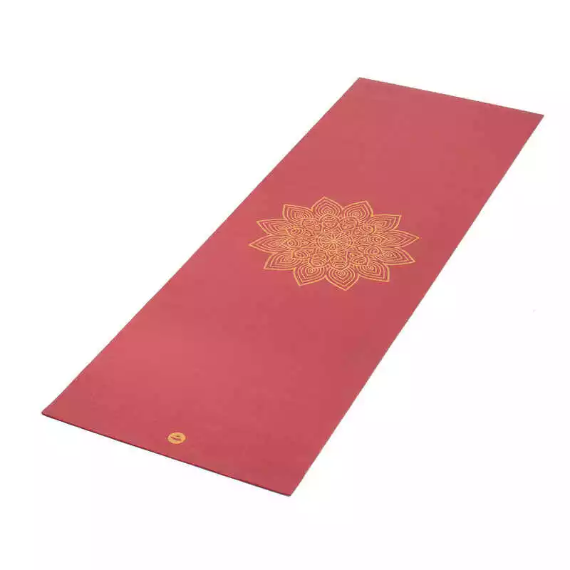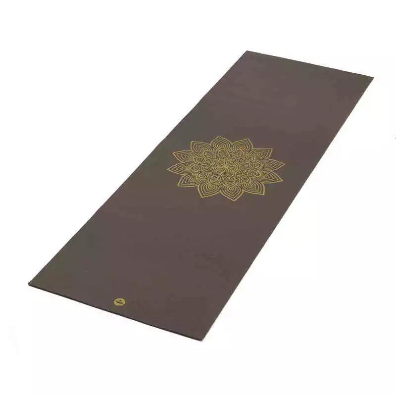 Unsere beliebte Rishikesh Premium Yogamatte ist unsere meistverkaufte Yogamatte. Sie ist besonders langlebig, widerstandsfähig und bietet mit ihren 4,5 mm Stärke eine sehr gute Dämpfung. In dieser Variante ist die Rishikesh Yogamatte mit einem goldfarbenen Mandala-Farbdruck versehen. Der Aufdruck befindet sich mittig auf der angerauten Seite der Matte.