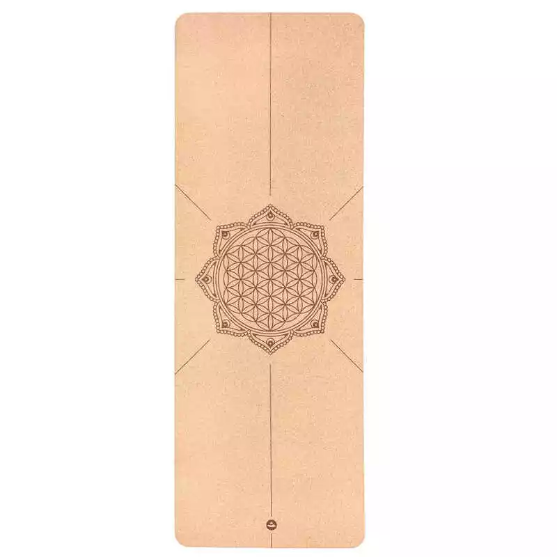 Wunderschöne Kork Yogamatte mit Blume des Lebens-Print und Alignment-Hilfe