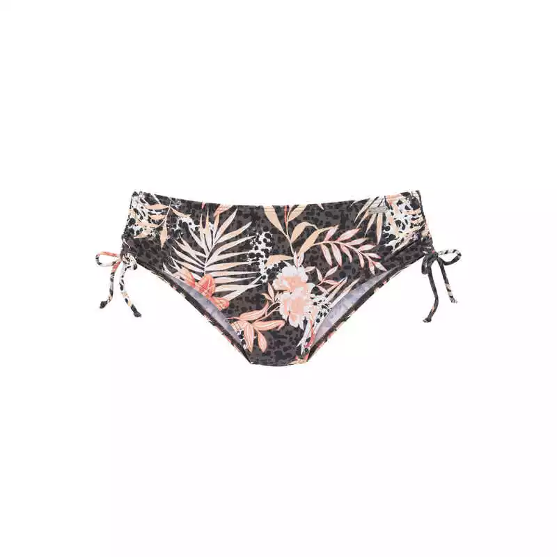 Bikinihose mit tropischem Alloverprint von Buffalo. Seitliche Bänder zum Raffen. Klassischer Schnitt. Weiche Qualität.