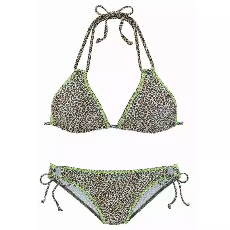 Triangel-Bikini mit trendigem Leoprint und neonfarbenen Ziernähten. Cups sind regulierbar. Nachhaltiges, recyceltes Obermaterial: 82% Polyamid , 18% Elasthan. Futter: 100% Polyester