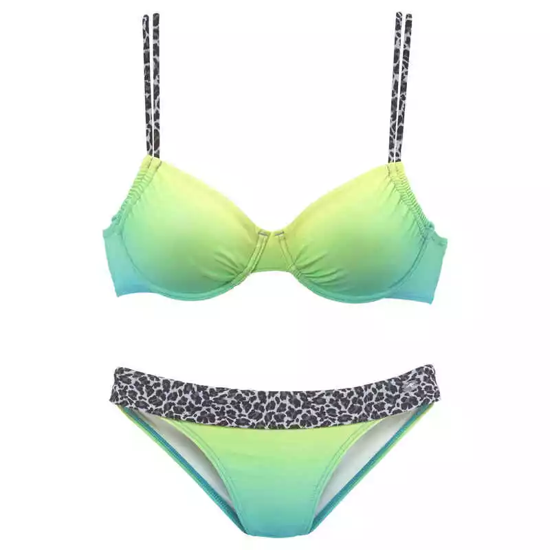 In modischre Batikoptik in leuchtenden Neonfarben. Zusätzlich trendige Details mit Leoprint. Top seitlich zu raffen, verstellbare Doppelträger. Der Bikini ist leicht gefüttert.