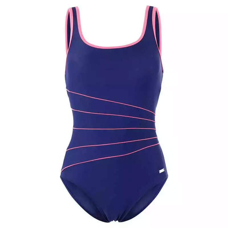 Im modisch-sportiven Style mit Kontrastpaspelierungen. Das Unterbrustgummi und der Shaping-Einsatz vorn zaubern eine wunderschöne Strandfigur. Cupbereich gefüttert.