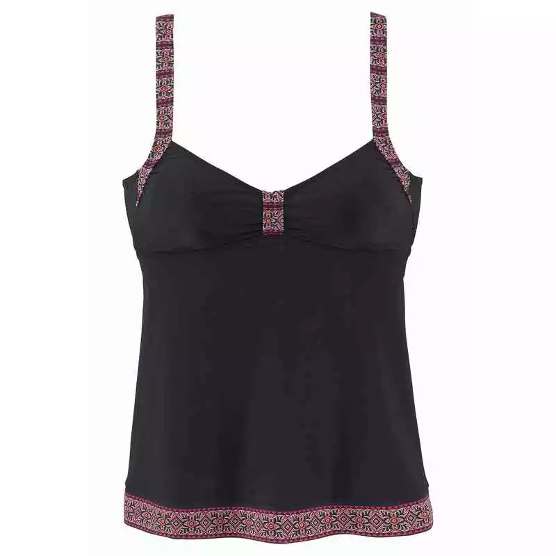 Mit bedruckten Kontrastblenden. Extralange Form in figurfreundlicher und leicht ausgestellter Form. Liegt nicht eng an und verdeckt den Bauch. Herausnehmbare Softcups und verstellbare Träger.