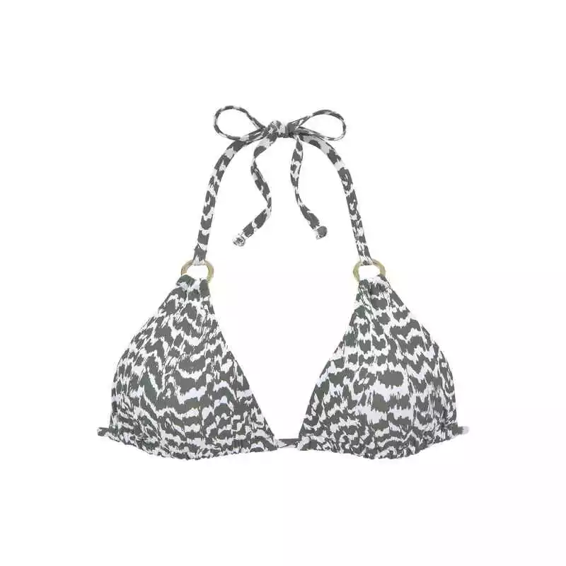 Triangeltop von Lascana. Mit abstraktem Alloverdruck. Metallisch glänzende Ringdetails oben an den herausnehmbaren Cups. Im Nacken und im Rücken zu binden. Mix-Kini-Prinzip. Weiche Microfaserqualität.