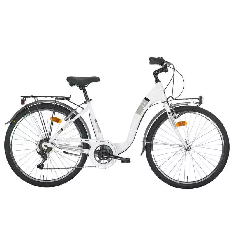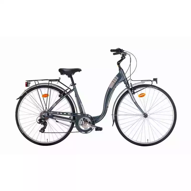 Perfekt für den Weg in die City oder den Weg zur Arbeit, das Montana Cityfahrrad AYDA überzeugt nicht nur durch seine hochwertigen Komponenten, sondern auch durch die zeitlose Optik. Die moderne Farbgeschaltung des leichten Aluminiumrahmens wirkt in Kombination mit den farblich abgestimmten Bauteilen besonders edel und der tiefe Einstieg erleichtert das Auf- und Absteigen deutlich. Dank der 7-Gang Kettenschaltung von Shimano mit dem komfortablen REVO-Schaltdrehgriff kommt man immer zügig und bequem ans Ziel. Die helle LED-Beleuchtung sorgt für gute Sichtbarkeit auch in der Dunkelheit und die robusten V-Brakes für eine optimale Bremsleistung, selbst bei nassem Untergrund oder unebenen Gelände. Der bequeme Sattel, Schutzbleche, Seitenständer und der winkelverstellbare Vorbau runden die Ausstattung des Fahrrades ab.