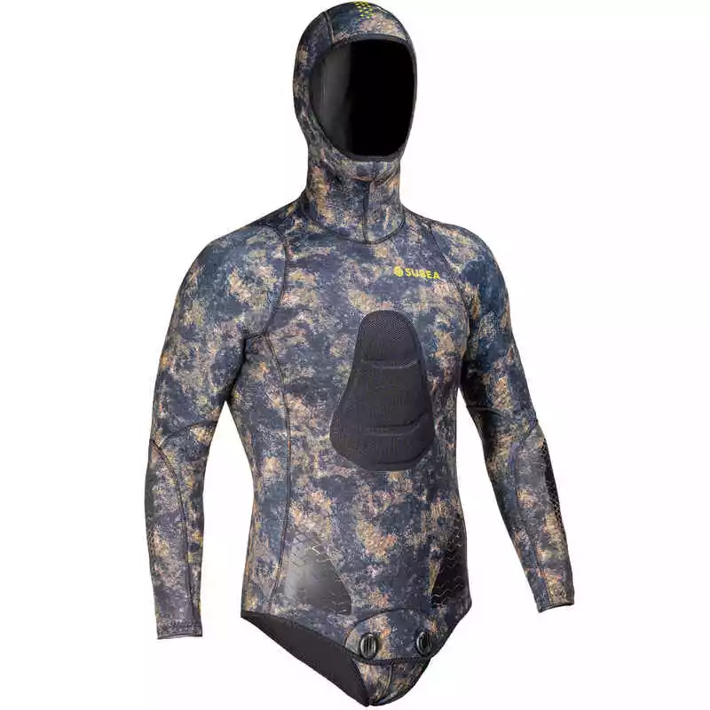 Modell Camouflage khaki (Neoprenanzug Ref. 8501841) hat ein realistisches Design in nahezu fotographischer Qualität, wodurch der Taucher quasi mit der Umgebung verschmilzt (Felswand, Korallen, Algen usw.).