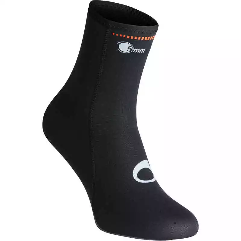 Neopren 5 mm. Die Nähte der Neoprensocken sind abgedichtet und als GBS-Nähte (Glued and Blind Stitched) ausgeführt: Um eine maximale Haltbarkeit zu erzielen, wird das Neoprenmaterial zuerst geklebt und danach genäht. Die Nadel sticht nicht vollständig in das Neopren ein, um das Eindringen des Wassers zu vermeiden.