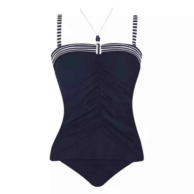 Modernes Tankini-Set mit gerafftem Oberteil mit Softschalen. Die Träger sind verstellbar und abnehmbar. Das Top mit gestreifter Borte am Dekolleté ergibt kombiniert mit dem Taillenslip einen unwiderstehlich eleganten Look.