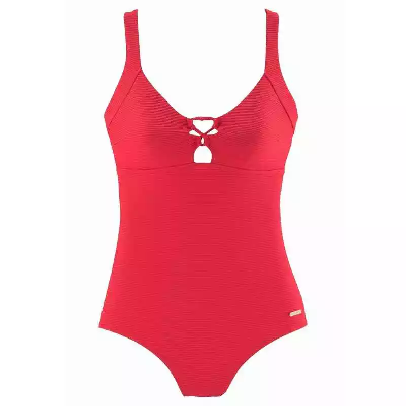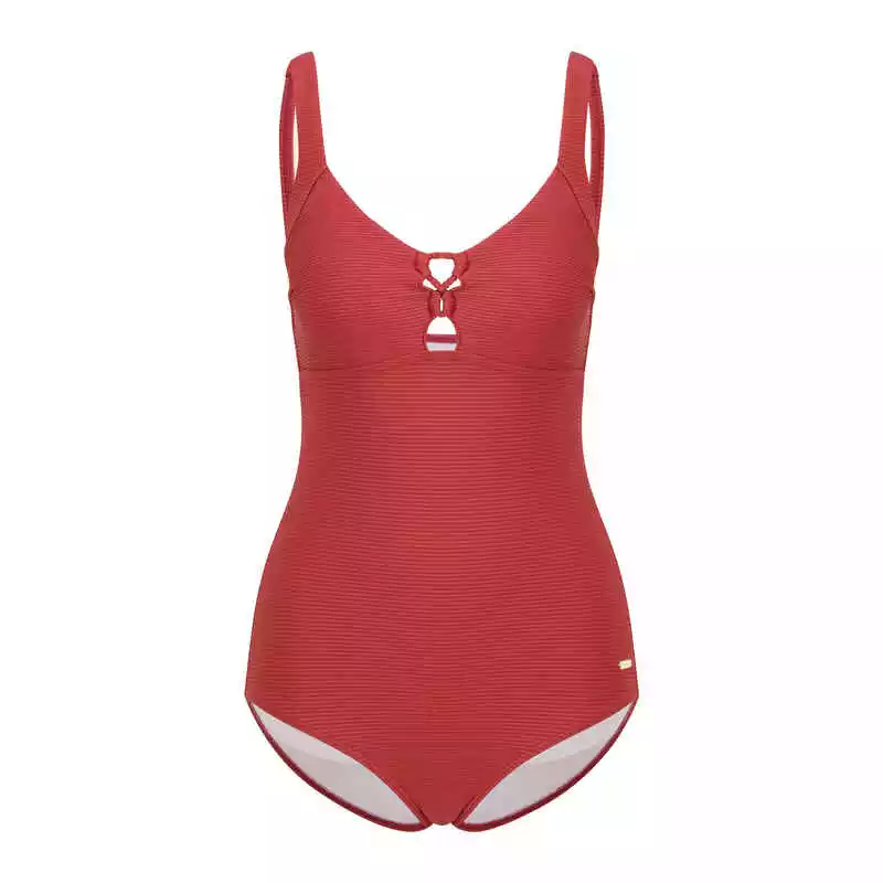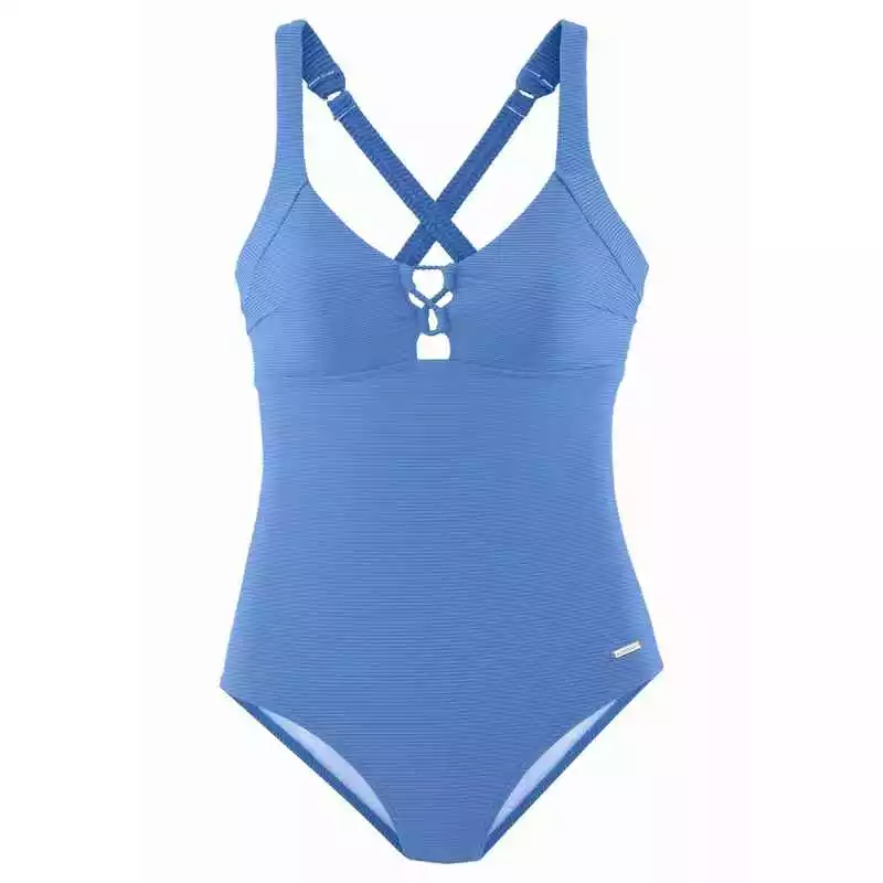 Aus modischer Strukturware mit Zierschnürung vorn am Dekolleté. Eingearbeitete Softcups und seitliche Stäbchen für guten Halt. Shaping-Einsatz vorn für eine schlanke Silhouette. Im Rücken abnehm- und verstellbare Träger, gekreuzt oder gerade tragbar.