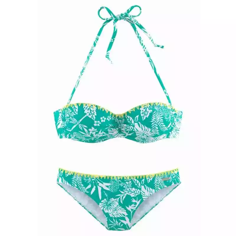 Bügel-Bandeaubikini von Venice Beach mit Alloverprint und Häkelkante. Wattierte Cups mit herausnehmbaren Kissen. Abnehmbare Träger. Klassisch geschnittene Bikinihose. Elastisches Material.