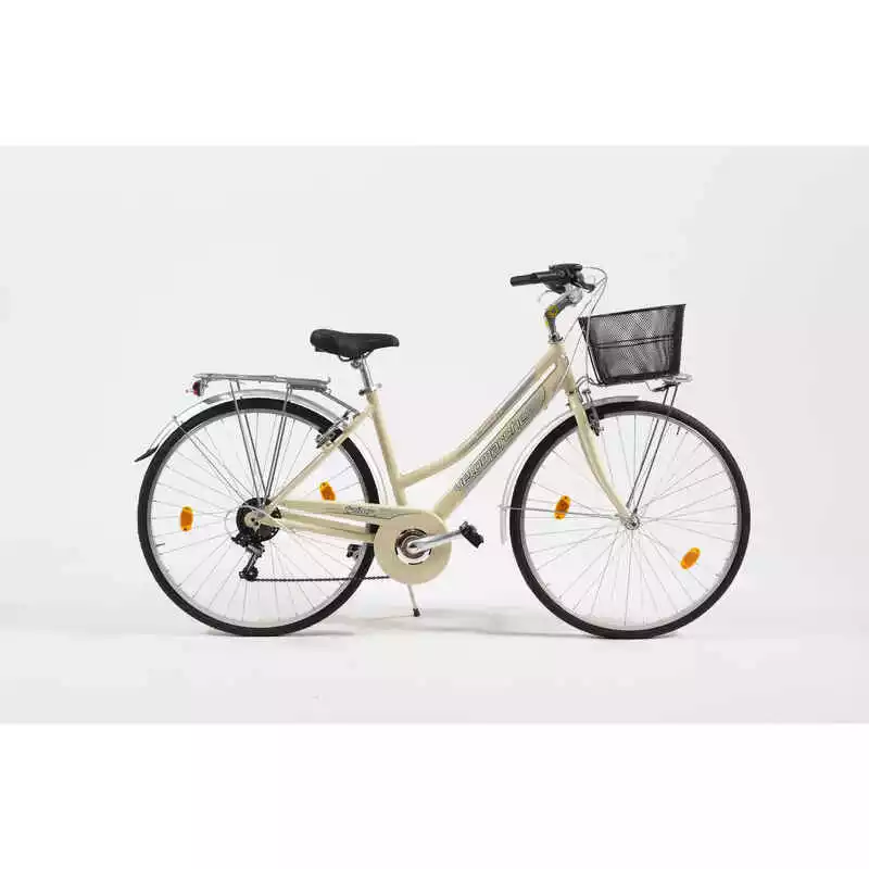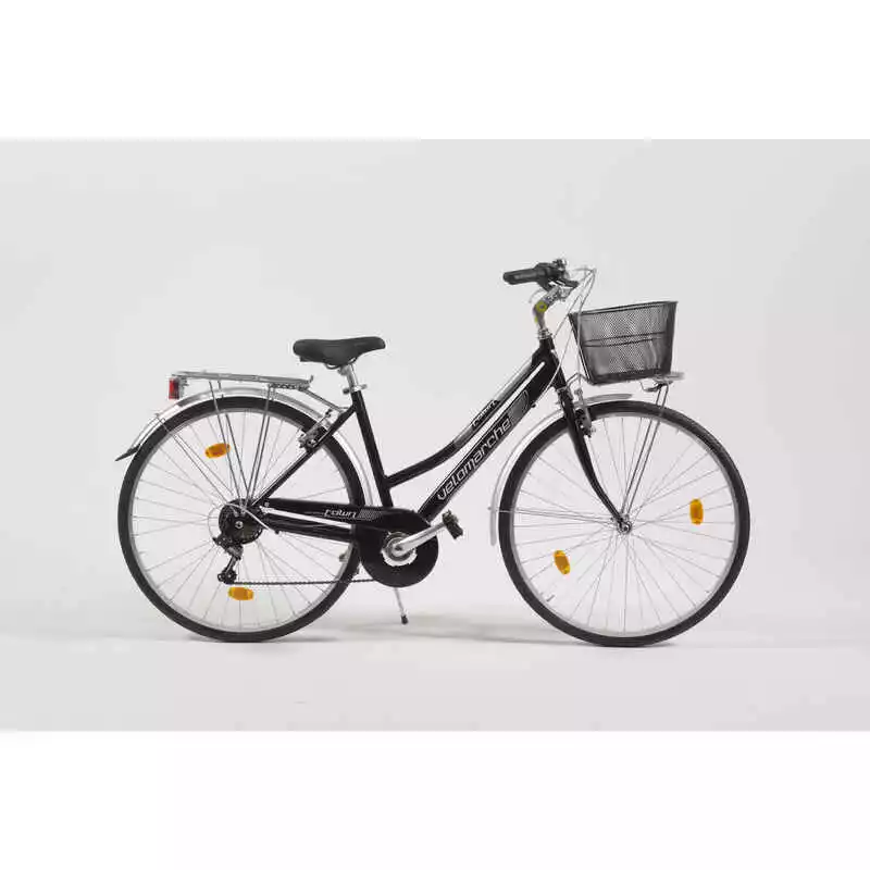 Ideal für die City oder für eine kleine Fahrradtour, mit dem Velomarche Cityfahrrad TOWN kommt italienisches Lebensgefühl auf. Das Fahrrad bezaubert mit seinem schicken Design, den schönen Rahmenfarben und den dazu farblich perfekt abgestimmten Elementen. Dank der 18-Gang Kettenschaltung kommt man immer zügig ans Ziel und meistert nahezu mühelos fast jede Steigung. Die robusten und zuverlässigen V-Bremsen bringen das Fahrrad jederzeit sicher zum Stehen. Im Korb auf dem vorderen Gepäckträger kann man schnell Einkäufe oder andere Kleinigkeiten verstauen. Abgerundet wird die Ausstattung des Citybikes durch die helle LED-Beleuchtung, Fahrradständer, Gepäckträger und die Schutzbleche mit Spritzschutz.